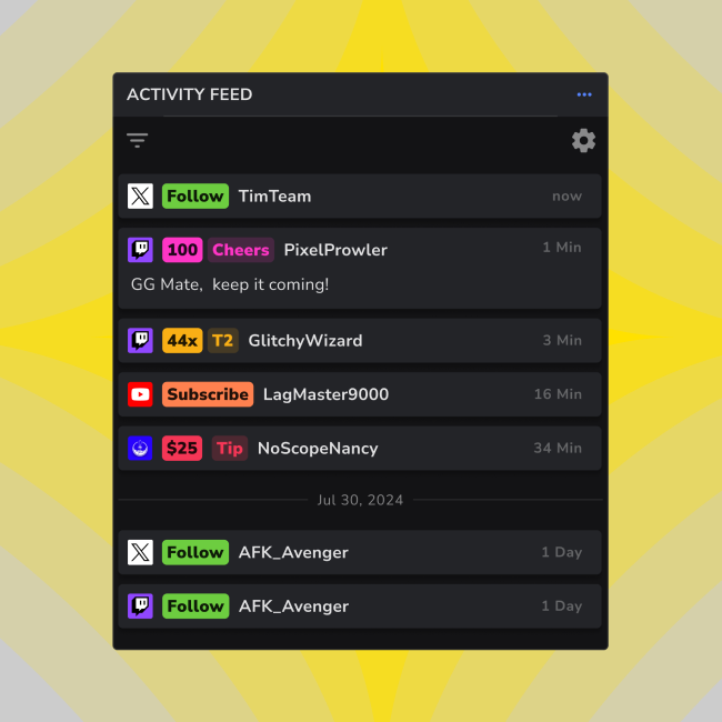 Keep an eye on all your stream activities across multiple platforms in one feed - Follows, Subs, Tips, Memberships and more.